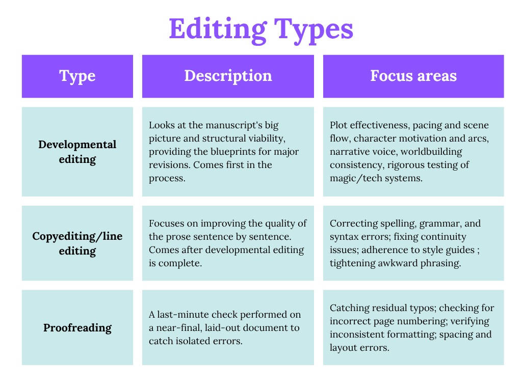 Knowing the difference between editing types helps you feel confident that you’re allocating budget correctly and staying on track with your publishing pipeline. Let’s weigh up developmental editing vs copy editing vs proofreading in a nutshell: