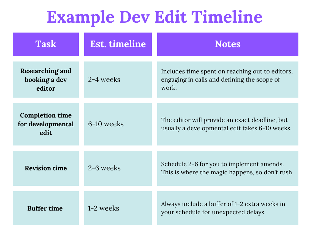 Keep in mind that every developmental editor will have a slightly different process, which is totally normal. As an example, below is what you can expect throughout a partnership with EV Editing: